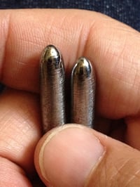 This is a pair of 100+ year old hardened-steel piano tuning pins. I have carefully ground and polished the bullet shaped ends to a chrome gleam which will beautifully flare your tubing out when creating your rivets. The squared off opposite ends enable easy striking with a hammer, as well as providing a comfortable no-slip fit into a table vise.